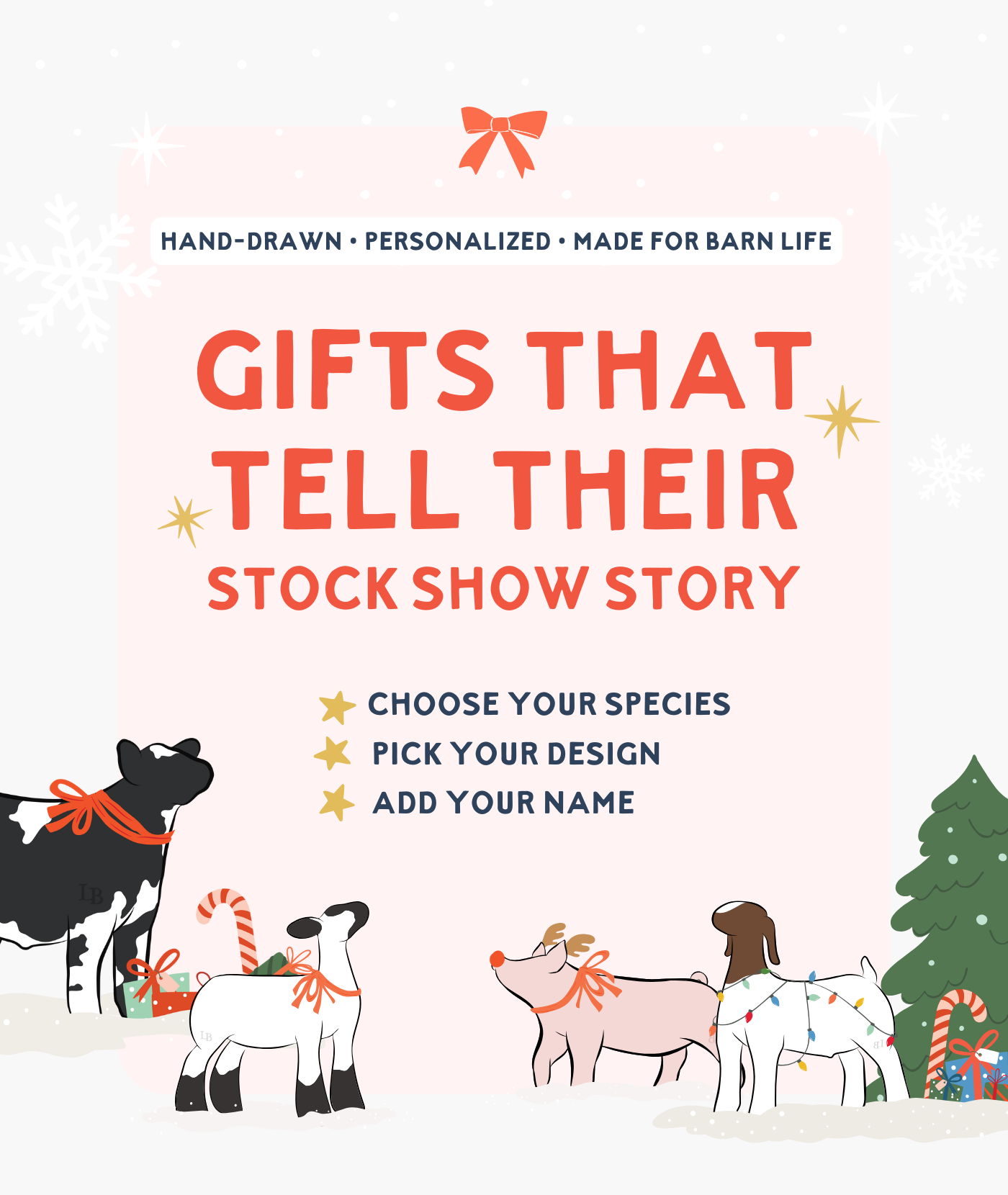 Each piece starts with our hand-drawn artwork, inspired by faith, family, and the livestock life we all love. Then you make it yours by choosing the colors, species, and words that matter most.