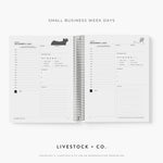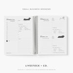 Friday mirrors the small biz daily view, while the weekend shares a single page, split into sections for events, to-do lists, and social media planning, keeping your business on track through the weekend.