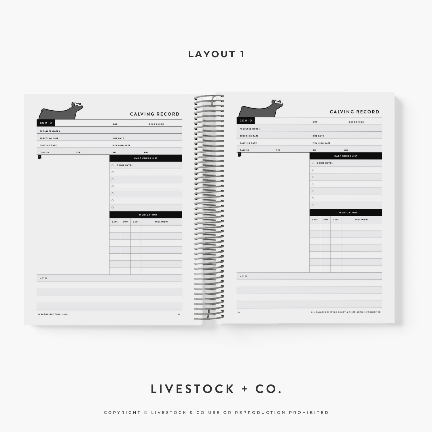 This layout is perfect for families who want a full picture of each birth. With room to record pre-calving details, calf data, health notes, treatments, and a simple checklist, it keeps everything organized in one place. Ideal for those who like clear, thorough records they can reference year after year.