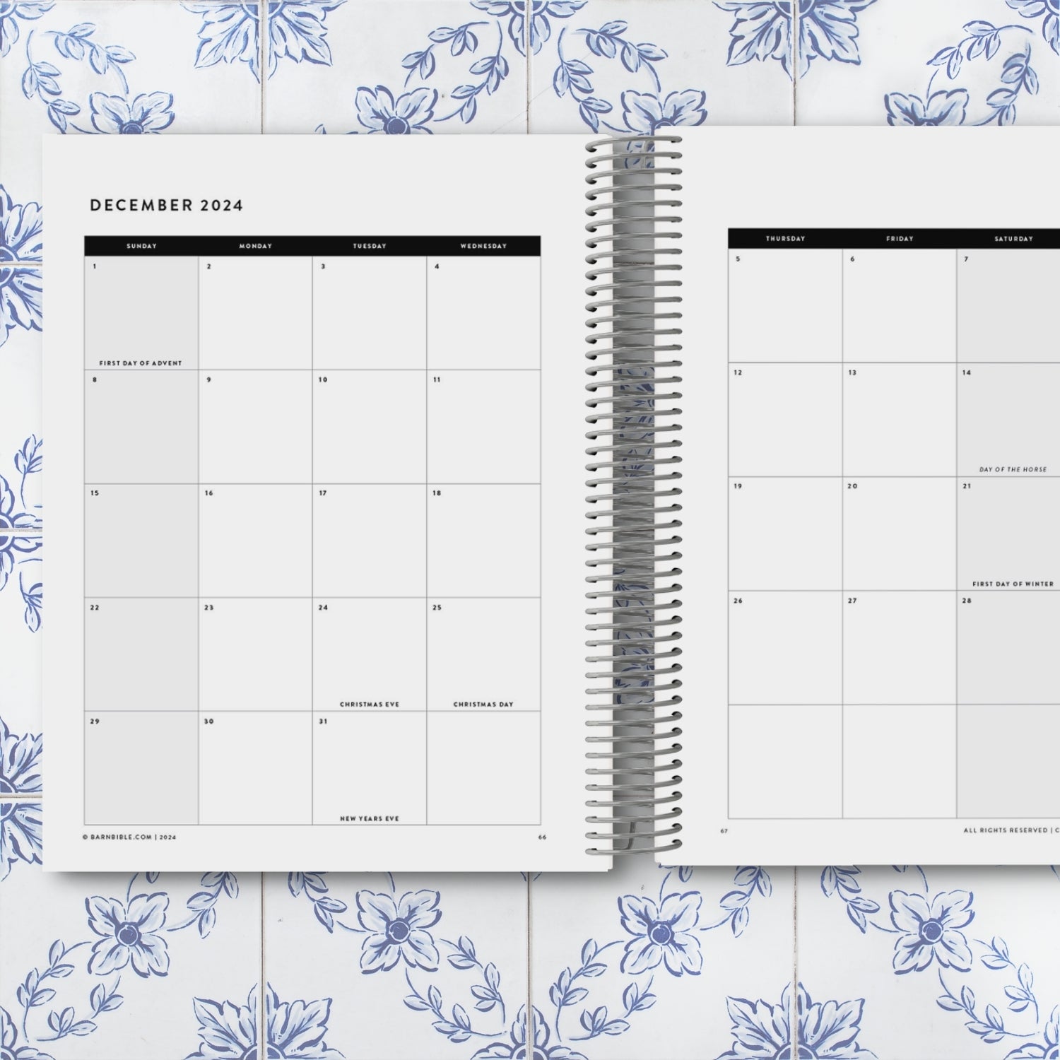 A simple, spacious monthly view designed to help you map out what’s ahead—school events, show weekends, breeding schedules, family commitments, and the rhythms that guide rural life. With wide open boxes and room for notes, this layout gives you clarity at a glance.